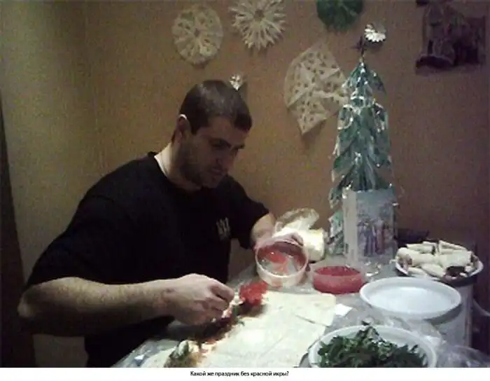На одном из снимков именинник сидит во главе не по-тюремному щедро уставленного стола - свежие фрукты и овощи, маринованные огурчики и домашний оливье. На другом - Кузнецов готовит обильно смазанный красной икрой бутерброд, на третьем - получает в специальном окошке еду из «Макдональдса».