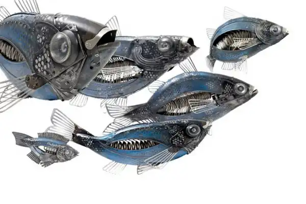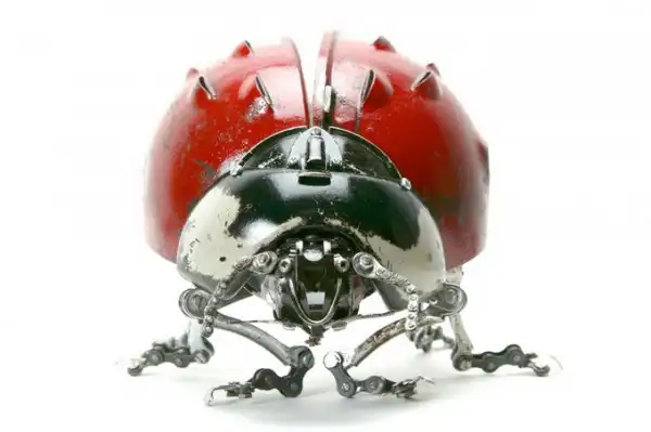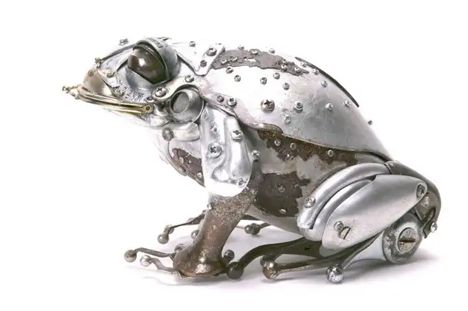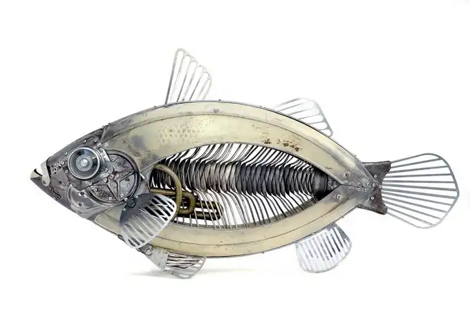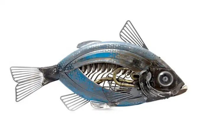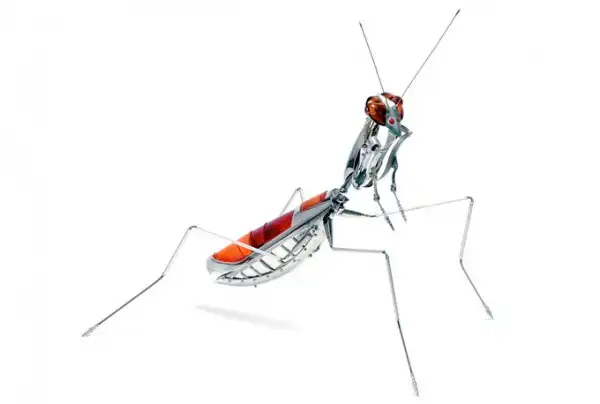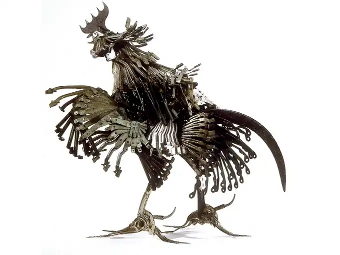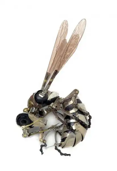 Он создает оригинальные скульпутры животных и насекомых из металлолома и предметов, купленных на распродажах.