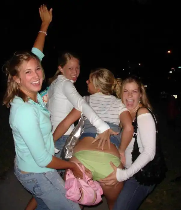 Пьяные девушки показывают свое нижнее белье, без помощи подруг не обошлось.