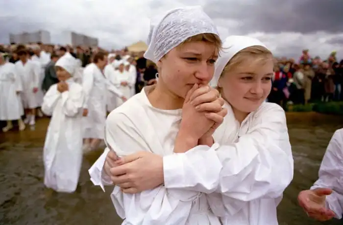 Стоя в обнимку в водах Москвы-реки, девушки ждут своей очереди во время крещения служителями Русской Баптистской церкви,1993 год.