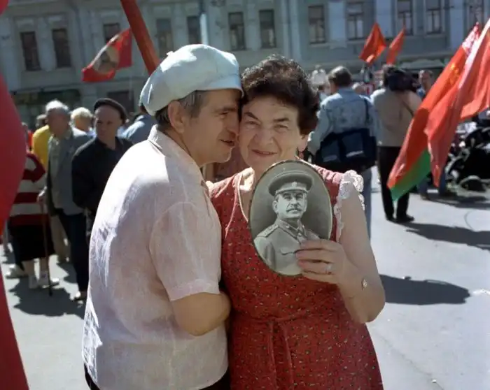 Пожилая пара с портретом Сталиным во время митинга коммунистов в поддержку кандидатуры Геннадия Зюганова на президентский пост.