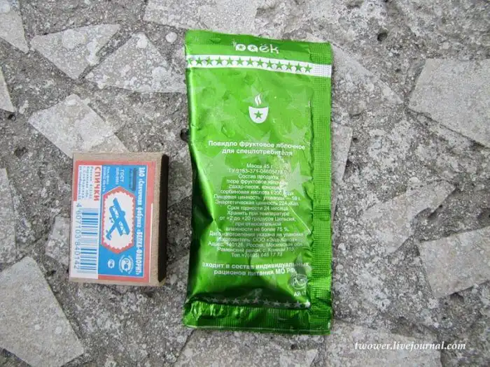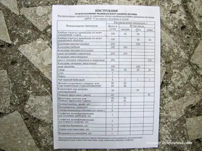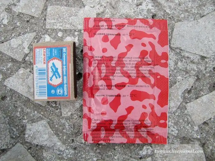 Да это "шляпа" какая то, а не паёк!!! На таком, в горах, загнёшся через неделю. ИРП-7(!) в войсках такого нет! Это видимо для военных кафедр и прочей полувоенной молодёжи!!! В армии обычно получаем ИРП-Б или МГРП. Просто для примера, по памяти: всё что здесь но больше, плюс сгущёнка в тюбике 200гр, шоколадка "Алёнка"50гр. или М&Мs, гороховый концентрат (очень вкусно), сухофрукты (изюм или чернослив), молоко сухое (на 200гр воды), акватабс 6 шт (таблетки для обеззараживания любой воды 1 на пол литра), салфетки бумажные (можно и для туалета), ну ещё с десяток полезных мелочей! Мог что то забыть, не обессутьте. А вообще то, рационы питания применяются для различных условий и местностей, но армейские запакованы в плотную вакуумную плёнку(защитного цвета. А это скорее туристический вариант сляпаный на скоро под армейский МГРП-Б! Приятного Вам аппетита!