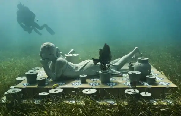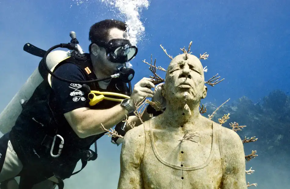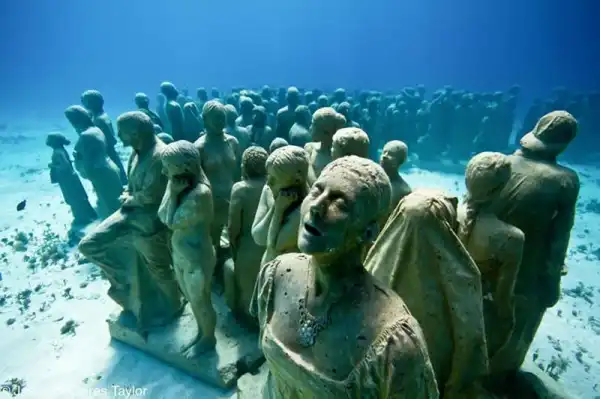 На дно этих бирюзовых вод, поигрывая отражениями солнца в море, были погружены скульптуры, образуя огромный подводный музей, прекрасно гармонирующий с красотой коралловых рифов.