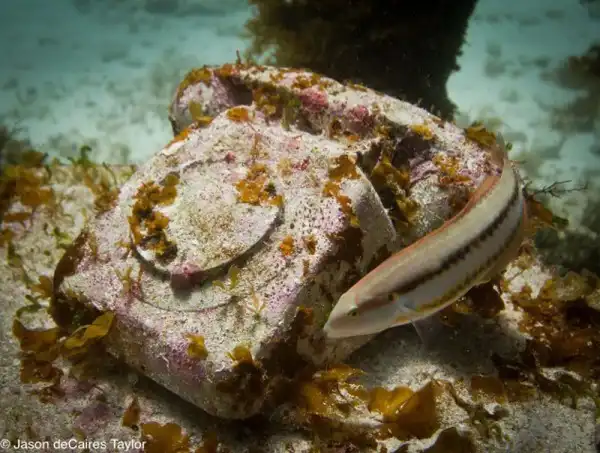 Бетонные поверхности скульптур полностью скрылись под водорослями и лишайником, а в их трещинах и деталях нашли пристанище тропические рыбки и ракообразные.