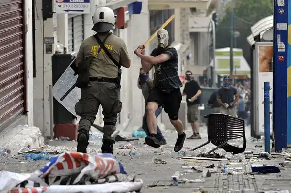 Мужчина с палкой нападает на полицейского во время всеобщей 48-часовой забастовки в Афинах 28 июня 2011 г.