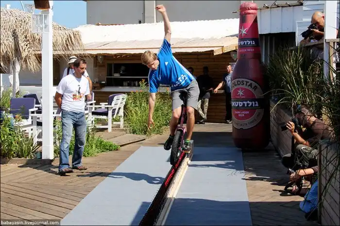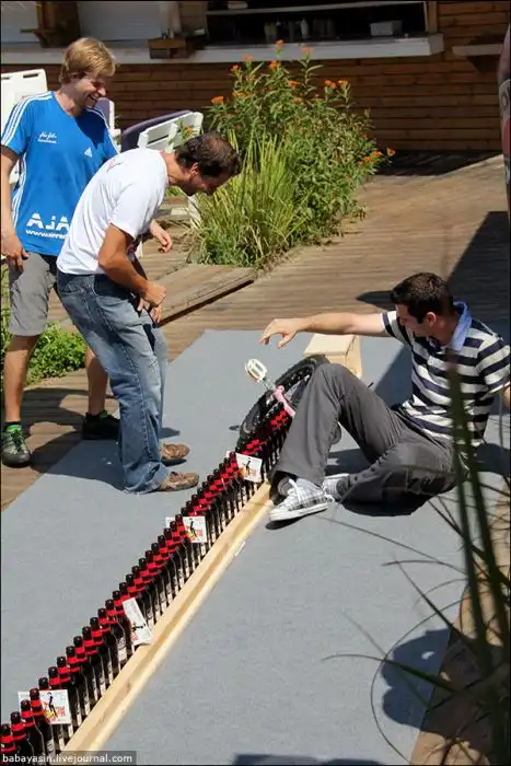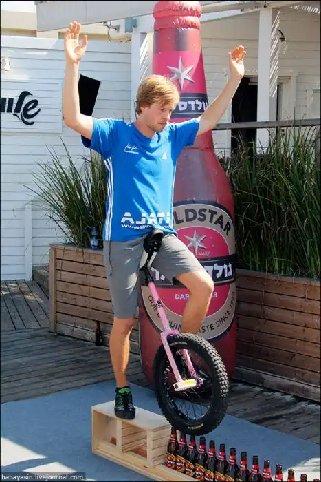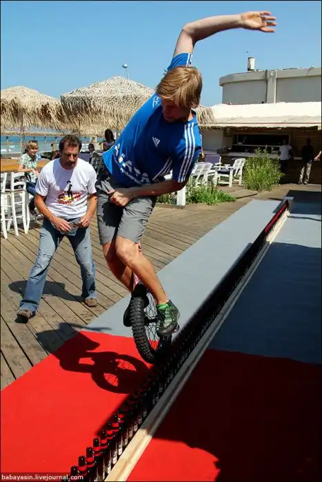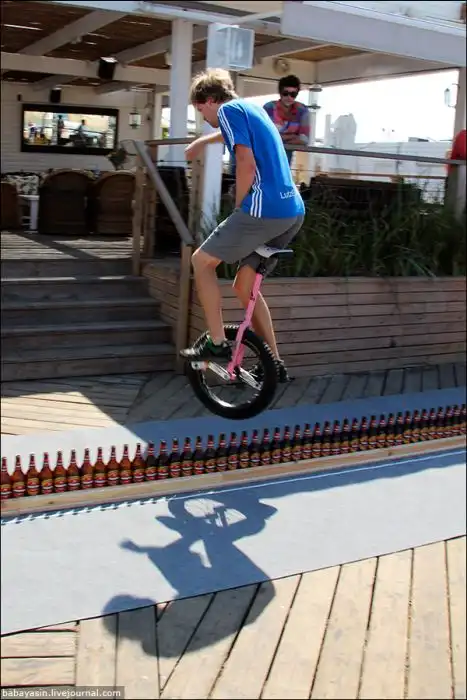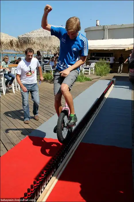 Виртуоз моноцикла из Луц Айхлез проехал по девятиметровому ряду из пивных бутылок.