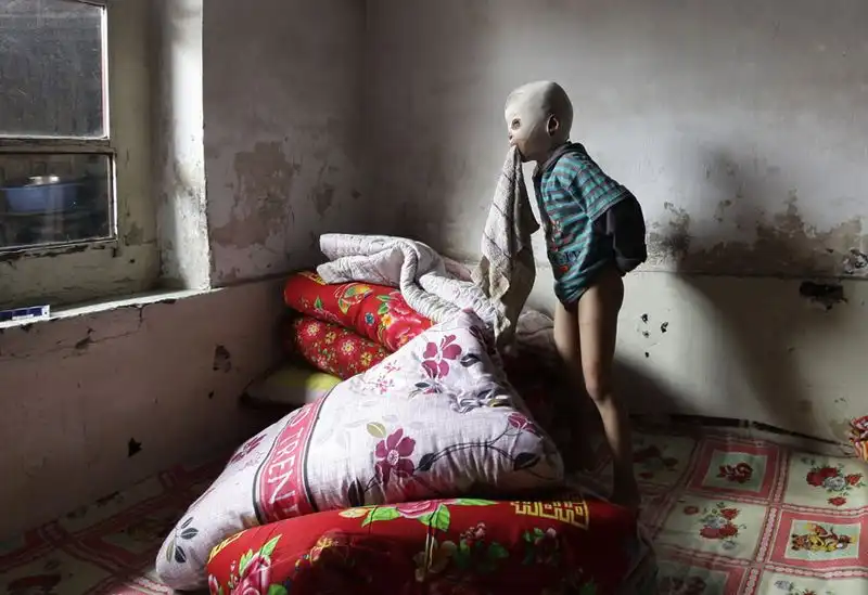 8. Ванг Гэнсян, также известный как "мальчик в маске", с полотенцем в зубах в своем доме в деревне Мийячуань, провинция Шанцзи, Китай, 9 сентября 2011 года. Шестилетний Гэнсян получил тяжелые ожоги в результате несчастного случая прошлой зимой. Большая часть кожи на его лице сгорела, и ему приходится носить маску, чтобы избежать заражения через шрамы. Врачи заявляют, что не могут продолжить лечение до тех пор, пока дыхательные пути полностью не восстановятся. (REUTERS/Jason Lee)