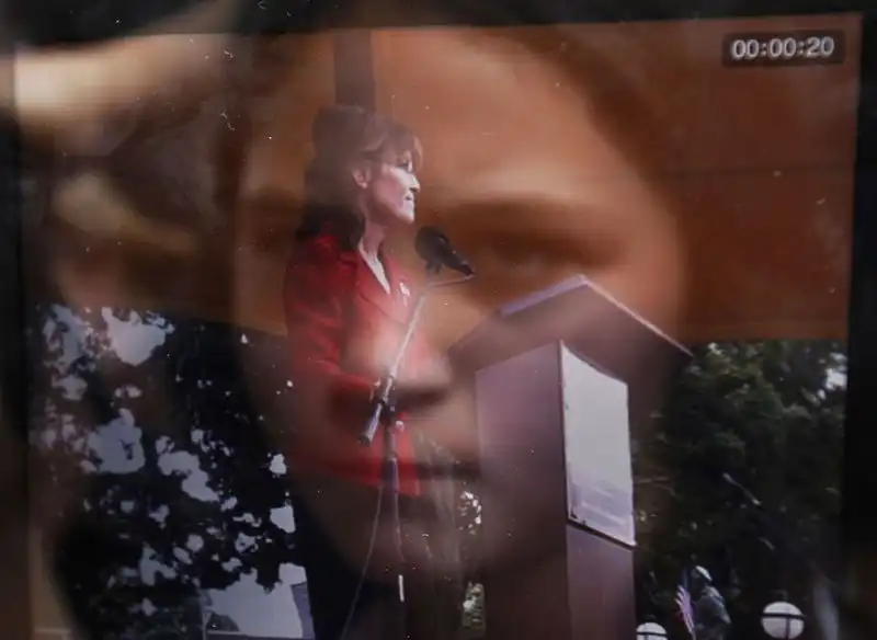 30. Отражение лица девушки, снимающей видео на свой iPad во время выступления губернатора Аляски Сары Пэлин в Манчестере, Нью-Хэмпшир, 5 сентября 2011 года. (REUTERS/Brian Snyder)