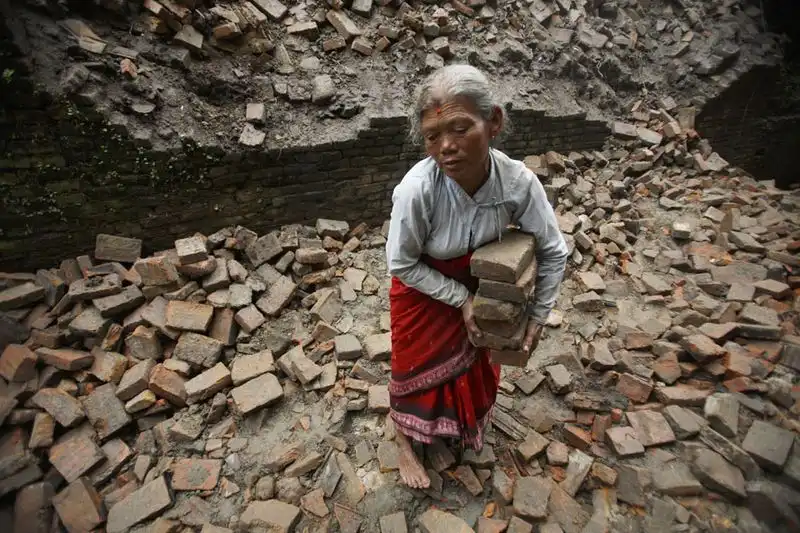 9. Семидесятилетняя Субадра Патхи рядом со своим домом после землетрясения магнитудой 6,8 баллов в Бхактапуре, 19 сентября 2011 года. Из-за землетрясения в горном районе Индии погибло четыре человека, в Непале – пять, также было разрушено множество зданий и образовались завалы на дорогах. (REUTERS/Navesh Chitrakar)