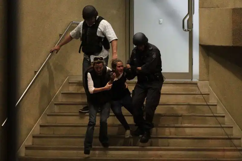 10. Полицейские спасают девочку, которую держали в заложниках в Парраматте, пригороде Сиднея, 6 сентября 2011 года. Мужчина, угрожавший взорвать бомбу, которая у него якобы была, захватил один из офисов, удерживая в заложниках собственную дочь. (REUTERS/Daniel Munoz)