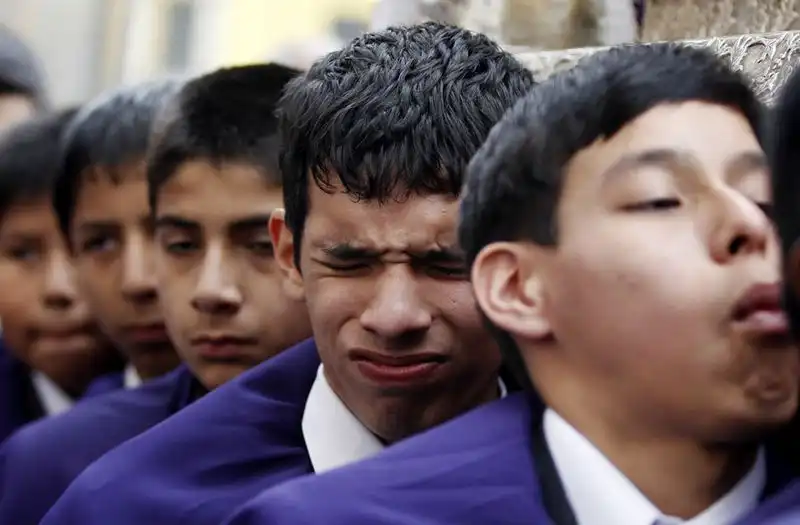19. Подростки в фиолетовых одеяниях несут копию наиболее почитаемой в Перу иконы, Лима, 4 сентября 2011 года. Каждый год 2500 детей из религиозной организации "Детское братство чудотворца" в возрасте от 9 до 15 лет принимают участие в шествии с 300-килограммовой копией иконы по площади Лимы. В XVII веке землетрясение разрушило большую часть города, но стена храма с этой иконой уцелела. (REUTERS/Enrique Castro-Mendivil)