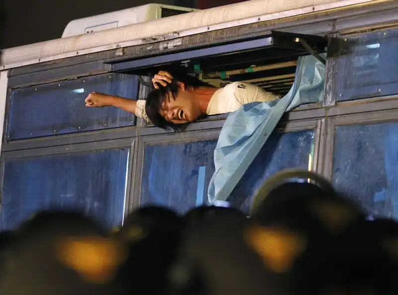 22. Студент выкрикивает лозунги, находясь внутри полицейского автобуса, после того как его задержали во время сидячей демонстрации на улице в центре Сеула, 29 сентября 2011 года. Студенты устроили демонстрацию, требуя от президента выполнения предвыборных обещаний о сокращении вдвое стоимости обучения и создания рабочих мест для молодежи. В демонстрации принимало участие 2500 человек. (REUTERS/Lee Jae-Won)