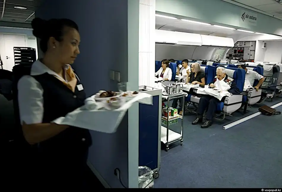 17. А в Алматы через несколько дней после первой встречи с пилотами группа кадетов вместе с своим учителем посетила в офисе "Эйр Астаны" тренинг- комнату, имитирующую салон "Boeing 757"