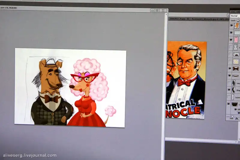 После собак я, вместе с Настей nastya_voronova заглянул к уже знакомому по предыдущему разу – Владимиру Торопчину, постановщику Царевича и серого волка. В ожидании его коллеги, режиссера еще одних богатырей, которые будут "... на дальних берегах", Володя рассказал нам с Настей едва ли ни всю свою биографию, как он половину своей жизни прожил вне анимации, ходил морем на кораблях советских, рисовал диафильмы и в итоге оказался на "Мельнице", где уже десяток лет работает сам, тут же и его супруга, а еще и их сын. Династия, однако!