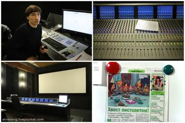 В ателье звукозаписи мы заглядывали в прошлый раз, а тут зашли основательно и подергали все ручки пульта – благо звукорежиссер Евгений был рядом и смог вернуть их после в рабочее положение. Тут же на выходе из звуковой студии видим газету с рассказом о "Барбоскиных" – к ним и направимся