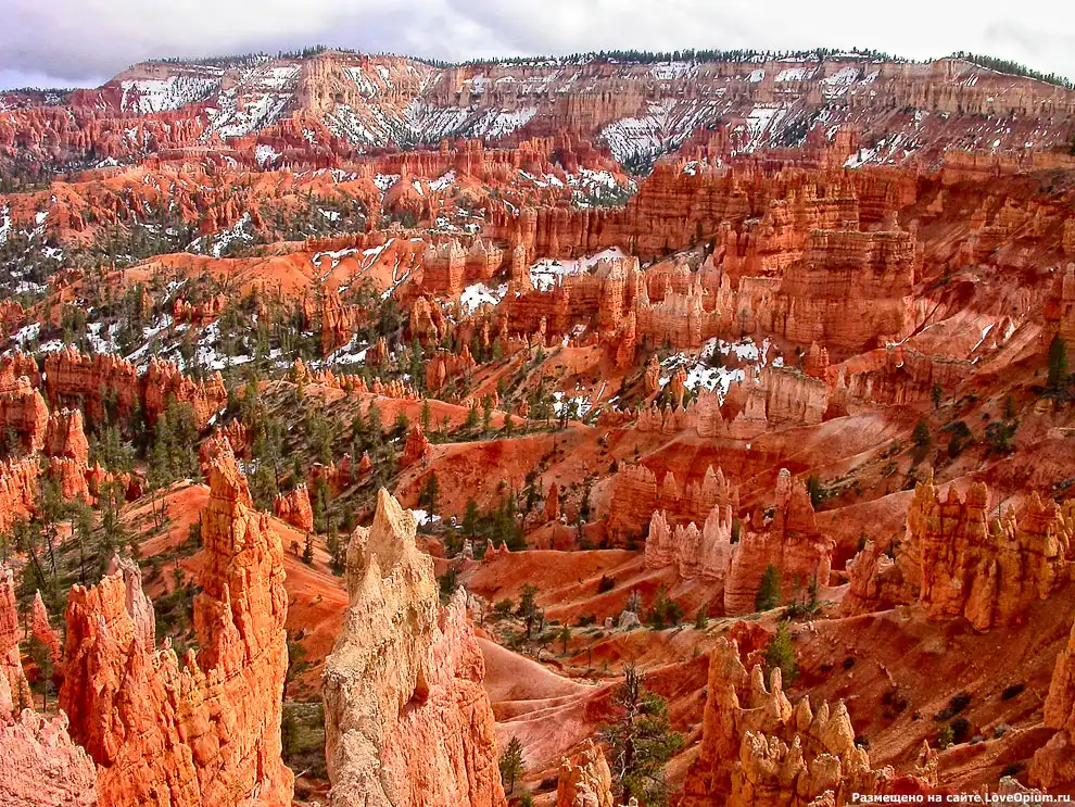 Каньон Брайс в национальном парке Брайс-Каньон, штат Юта, США. Он похож на гигантский природный амфитеатр, созданный эрозией почвы. Красные и оранжевые горные породы выглядят особенно захватывающе на фоне заката Солнца: