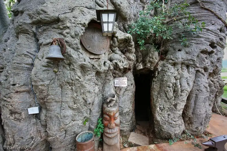 Баобаб Sunland Baobab один из самых известных баобабов в Южной Африке. Имея длину окружности 33 или 47 метров и высоту 18-22 он также является одним из крупнейших в своём роде. Несмотря на неточности в расчётах, думаю, вы согласитесь, что он баобаб на фотографии огромен. О егго размерах можно судить и потому факту, что внутри него смог легко разместиться небольшой паб. Может быть именно из-за этого баобаб Sunland Baobab является самой популярной достопримечательностью в районе своего местонахождения. Что интересно, дерево никто специально не долбил, полость внутри него имеет естественное происхождение. Небольшой паб внутри неё был оборудован в 1933 году. Помещение паба способно вместить 15 человек. Дерево находится на ферме, принадлежащей семье Van Heerden, которые и ухаживают за ним.