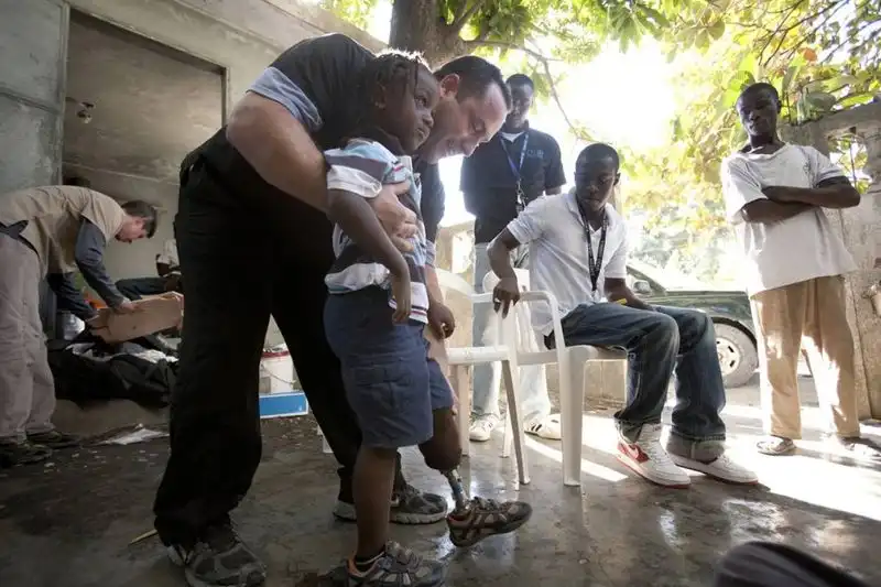 Тью удлиняет протез Шнэйли, но понятно, что ему понадобится новый. До того, как организация «Hanger Orthopedic Group» и другие начали производить протезы на Гаити, многие ампутанты просто ходили без них. (Nadav Neuhaus for msnbc.com)