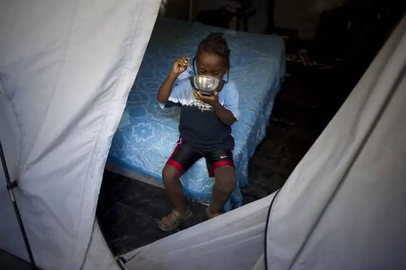 Вот Шнэйли Симильен завтракает в потрепанной палатке. Эта палатка в городке Леоган теперь служит домом для всей его семьи из пяти человек. В начале ноября, когда над Гаити пронесся ураган Томас, палатка была еще больше повреждена. Протез левой ноги, который мальчик получил в марте, уже начинает понемногу ломаться, но у семьи нет средств, чтобы обратиться за помощью в госпиталь Альберта Швейцера, который находится в городе Дешапель.