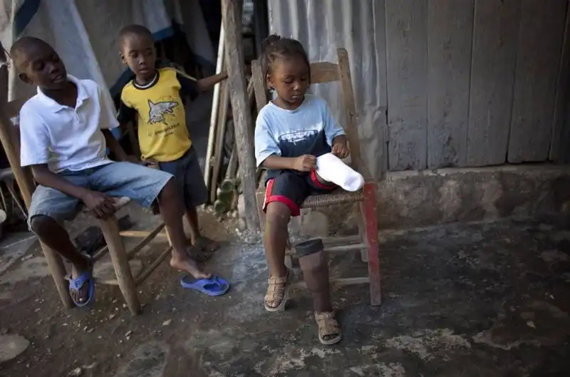 Шнэйли Симильен забавляется тем, что строит рожицы фотографу. Отчаяние, царящее вокруг него, пока не уменьшает детского задора. После землетрясения прошло уже больше десяти месяцев, а семья все еще живет на руинах дома его бабушки. С каждым днем его протез все больше ломается – нижняя часть уже настолько сильно растрескалась, что мальчику трудно ходить прямо.