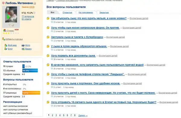 Если это не фейк, то Любовь Матвеевна, активный пользователь сервиса "Леди.майл.ру" и по совместительству мама двоих детей, конченная дура. Если бы я былf сыном Любови Матвеевны, я бы повесился сразу после рождения. Посмотрите, какие вопросы мамаша задает на форуме, советуется с сочувствующими в вопросах воспитания сына и дочери.