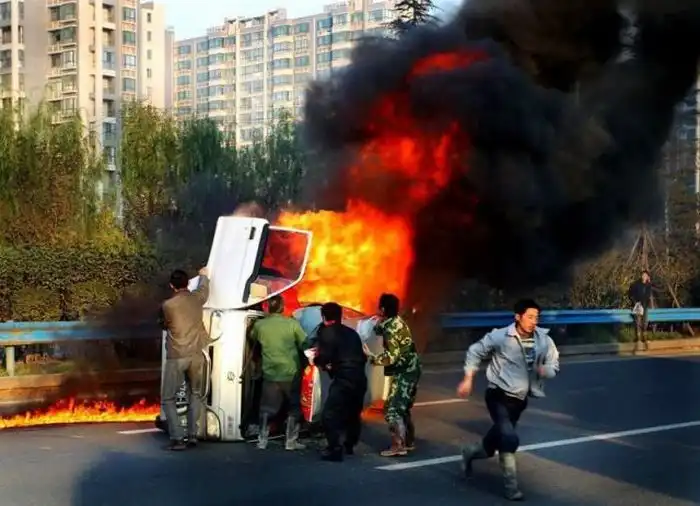 Из-за несчастного случая на дороге вспыхнул автомобиль. Удивительно, но все люди, находящееся в нем, выжили. Они быстро вылезли из пылающей машины, помогая товарищам, которые остались внутри.