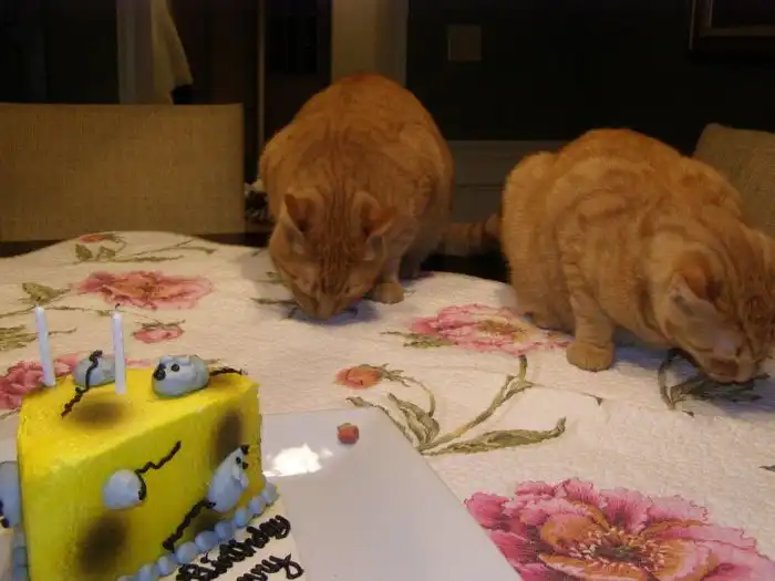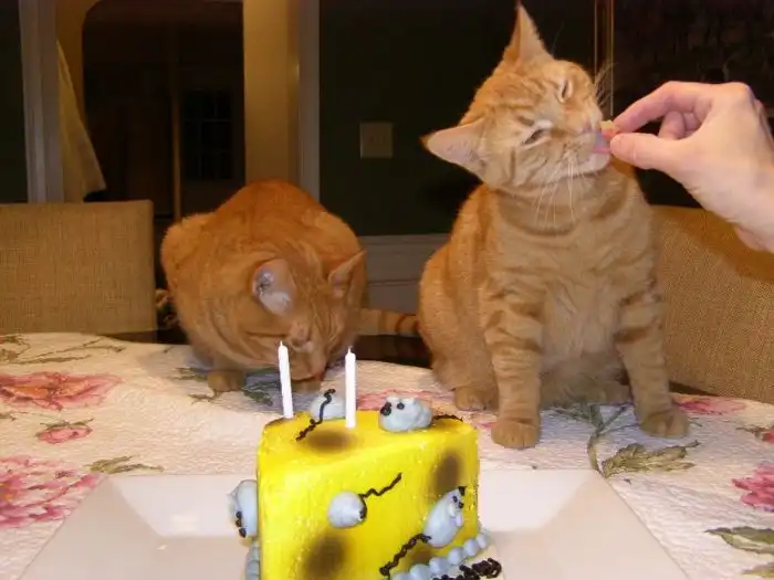 Два кота расплылись в улыбке после того, как попробовали именинный торт :)Позитивно.