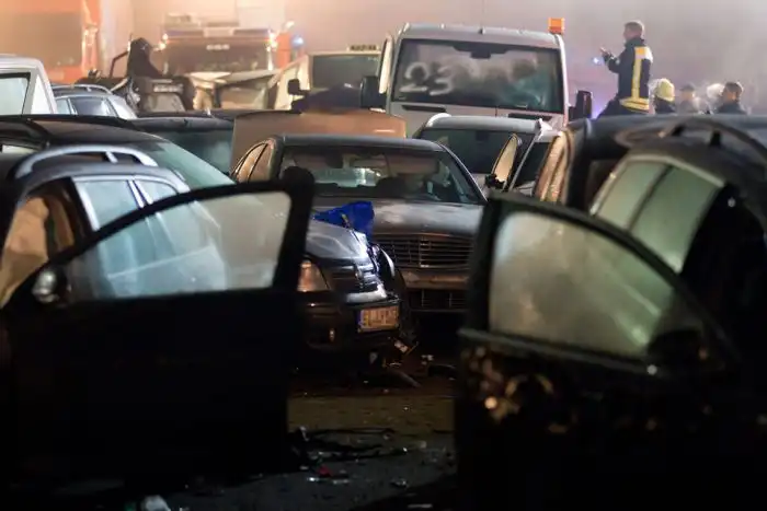 В Германии произошла невероятно крупная авария. Из-за густого тумана видимость на дороге была очень плохой, что и стало причиной столкновения 52 автомобилей.Погибло 3 человека, а 35 было ранено.