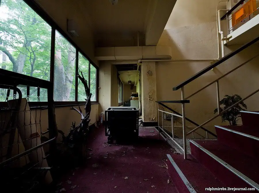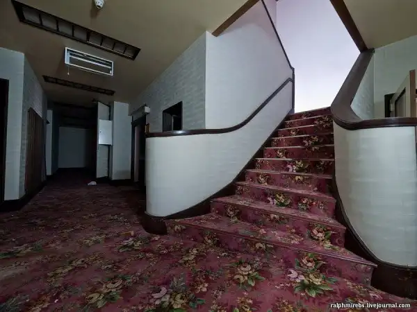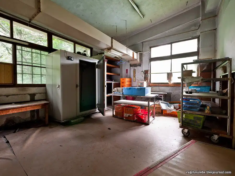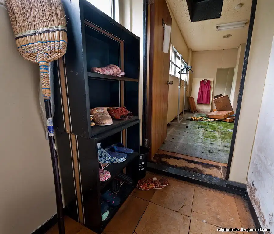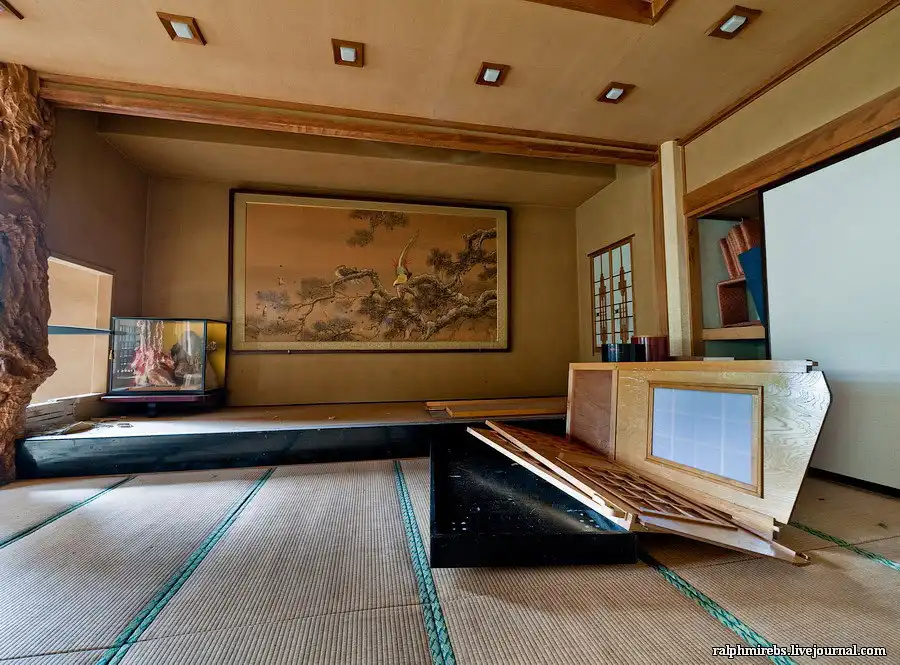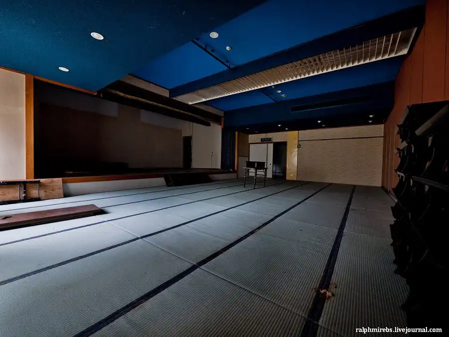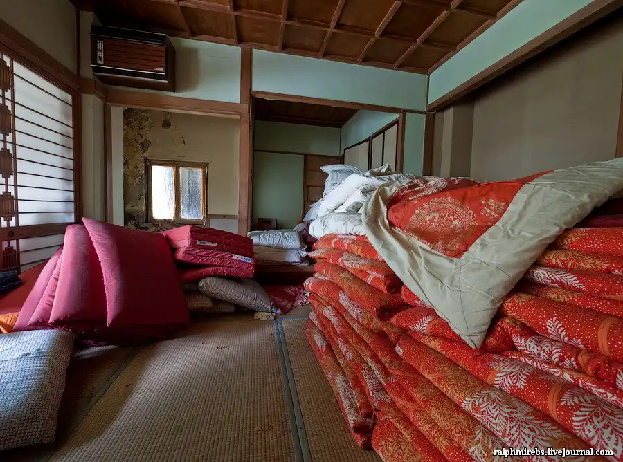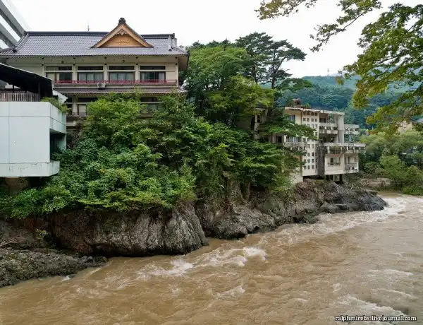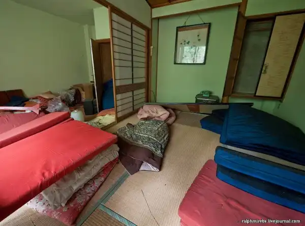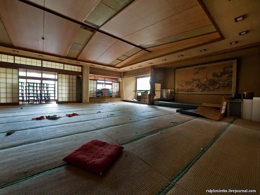 Огромные обеденные залы, устланные татами - замечательное место ночлега одинокого туриста. Именно в этих отелях я обнаружил нераспечатанный ящик минеральной воды, три ящика спичек, ящик мыла и множество других полезных в походе вещей. Отель, а точнее комплекс из четырёх зданий различной архитектуры, расположен на берегу небольшой горной речушки и его географическое позволяет служить воротами на западное побережье Японии. Самое крайнее из зданий буквально нависает над водою, являясь фотокарточкой тамошних мест. Весь комплекс давно заброшен.