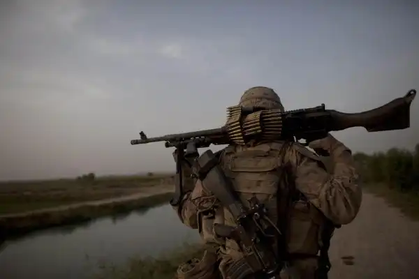 5. Морской пехотинец США ведет огонь из крупнокалиберного пулемета во время ожесточенной перестрелки с талибами на патрульной базе 302, 25 августа 2011 года. (AP Photo/Brennan Linsley)