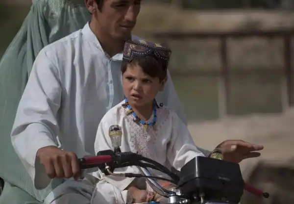 23. Афганец с женой и девочкой проезжает на мотоцикле мимо патрульной базы 302, Афганистан, 25 августа 2011 года. (AP Photo/Brennan Linsley)