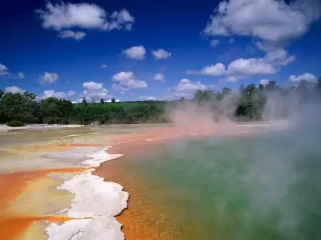 В геотермальном регионе Северного острова Новой Зеландии Уаи-О-Тапу есть целый бассейн с шампанским. На самом деле это горячий термальный источник. Он расположен в 30 км к юго-востоку от Роторуа и около 50 км на северо-запад от Таупо. Название Бассейн с шампанским (Champagne Pool) получено благодаря обильным выбросам углекислого газа (CO2), что делает воду в источнике похожей на шампанское.