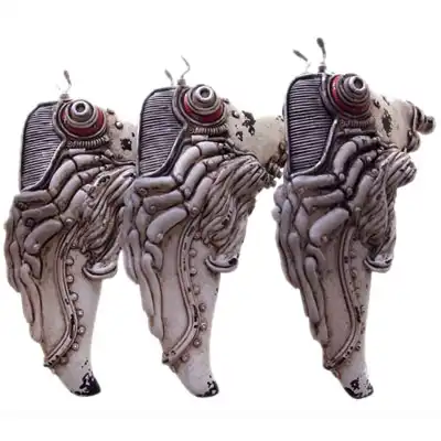 Автор берет вдохновение из детских воспоминаний о сломанных устройствах. Для своих работ он использует старые механизмы, глину и акриловую краску.