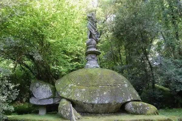 Среди скульптур парка - Пегас, две сирены, Протей, слон Ганнибала, дракон, гигантская черепаха, Геракл, пес Цербер, две Цереры, Афродита, Врата Преисподней и другие, среди сооружений - Падающий дом, миниатюрный Сад природы, Храм Вечности. Сюжеты скульптурных изображений, как предполагается, восходят к Сну Полифила, поэме Бернардо Тассо Флоридант и Неистовому Роланду Ариосто. Их аллегорическая символика не раз и по-разному толковалась исследователями. Пегас и гигантская черепаха: