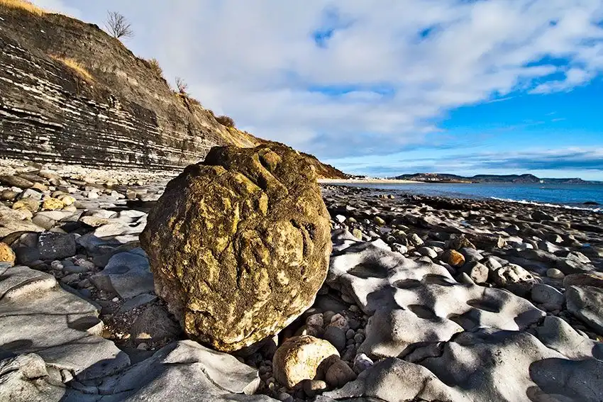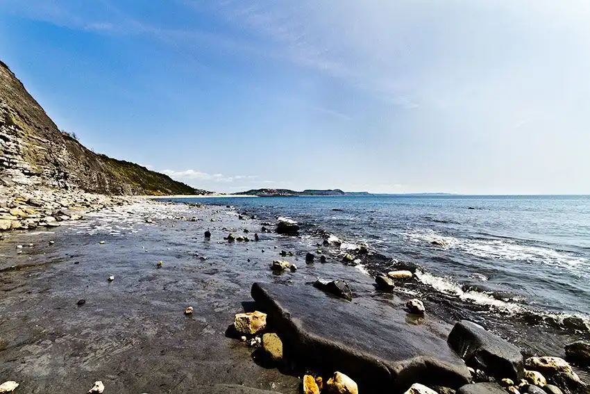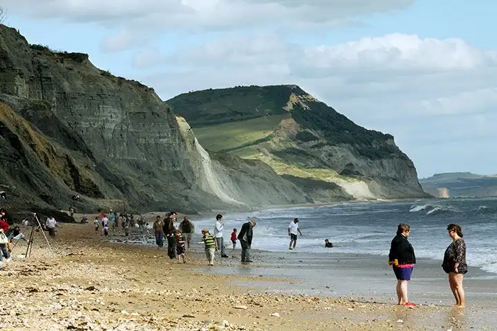 Пляж Юрского периода расположен в английском графстве Западный Дорсет, недалеко от селения Лайм Реджис. Конечно, здесь нет динозавров, но прибрежные скалы содержат множество окаменелостей древних моллюсков аммонитов