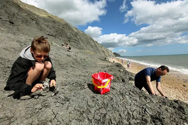 Туристы ищущие окаменелости вдоль побережья