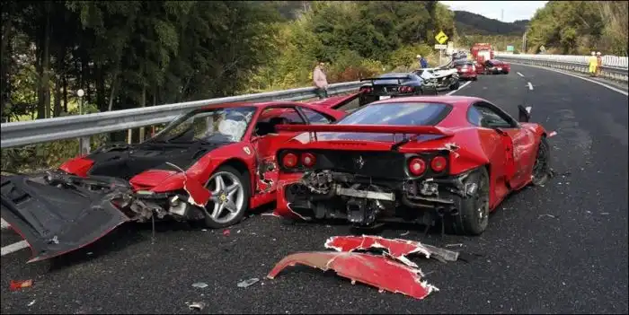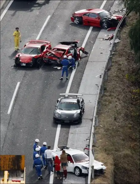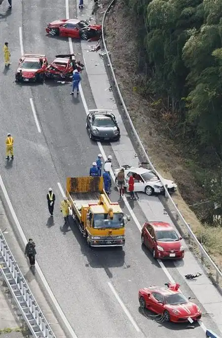 В Японии на скоростном шоссе произошла самая дорогая авария в стране. В ней пострадало 14 автомобилей, из них: две Ferrari 355s, две Ferrari 360, две Ferrari 430s (одна из которых была редким вариантом Scuderia), Ferrari 512, Lamborghini, три Mercedes-Benz и Toyota Prius.