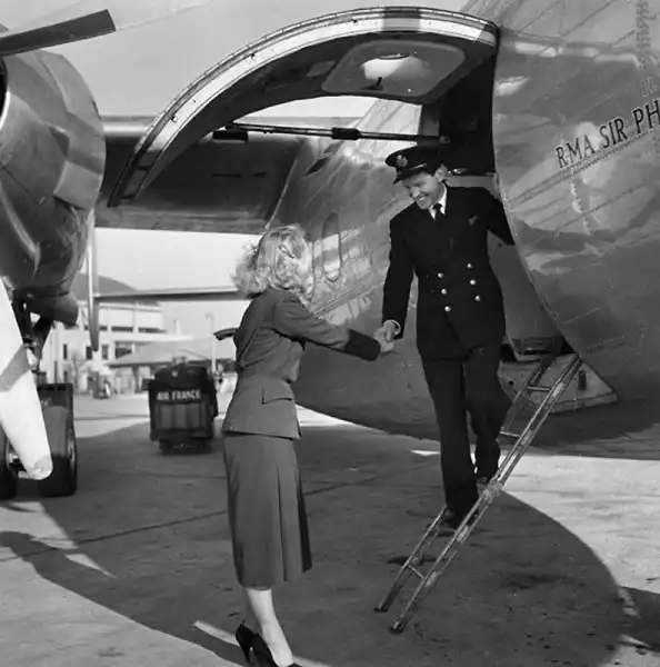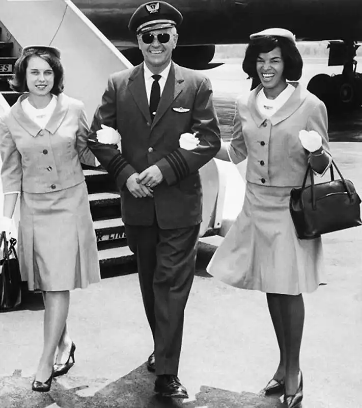 3. Капитан Л.Л. Трис с двумя стюардессами отправляется в комнату отдыха после быстрого перелета из Чикаго в Вашингтон. (Bettmann / Corbis)