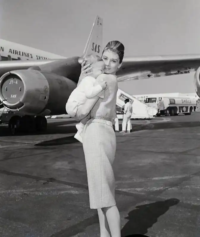 19. Одри Хепберн с 7-месячным сыном Шоном отправляется в Рим, чтобы затем встретиться с тогдашним мужем Одри Мелом Феррером. (Bettmann / Corbis)