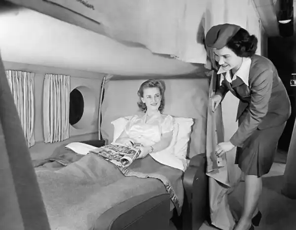 2. Пассажиры на борту «Boeing Stratocruiser». Этот двухэтажный самолет был снабжен кроватями и VIP-комнатой с баром. Так что долгие перелеты превращались в приятное путешествие. (Bettmann / Corbis)