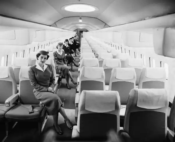 5. Это копия первого салона самолета в США в 1956 году. Стюардессы позируют в самолете «Boeing Jet Stratoliner» на 98 мест, в котором был кондиционер, вода, печи, холодильники, свет для чтения и аварийные выходы. (Bettmann / Corbis)