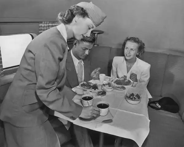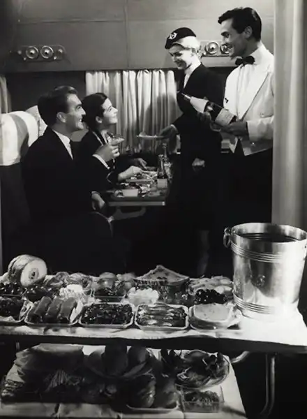 8. Пассажиры «Air France» наслаждаются изысканными деликатесами и приветливыми улыбками бортпроводников. (Corbis / Bettmann)