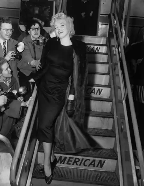 13. Мэрилин Монро на трапе самолета «American Airlines» в Нью-Йорке на пути в Голливуд в 1956 году. (Bettmann / Corbis)
