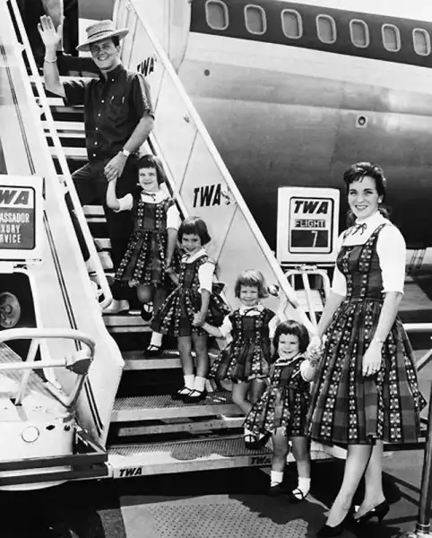 14. Пэт Бун с семьей прощается с Нью-Йорком, поднимаясь на борт самолета, который отвезет их домой – в Голливуд. (Bettmann / Corbis)
