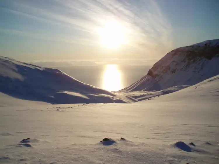 Полярная ночь.В конце октября солнце бросает свои последние лучи на ландшафты тундры, и Свальбард вступает во время темноты. Более двух месяцев, с ноября по начало февраля, здесь темно 24 часа в сутки. Полярный день. В апреле дни становятся все более долгими, и вскоре солнце уже не заходит за горизонт.