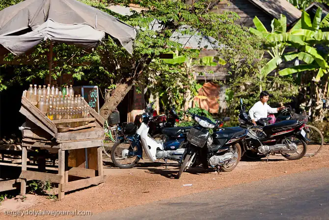 Машин практически ни у кого нет, зато вся страна ездит на мопедах. Бензин продают в пластиковых бутылках:
