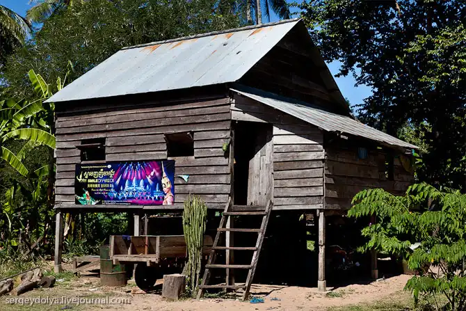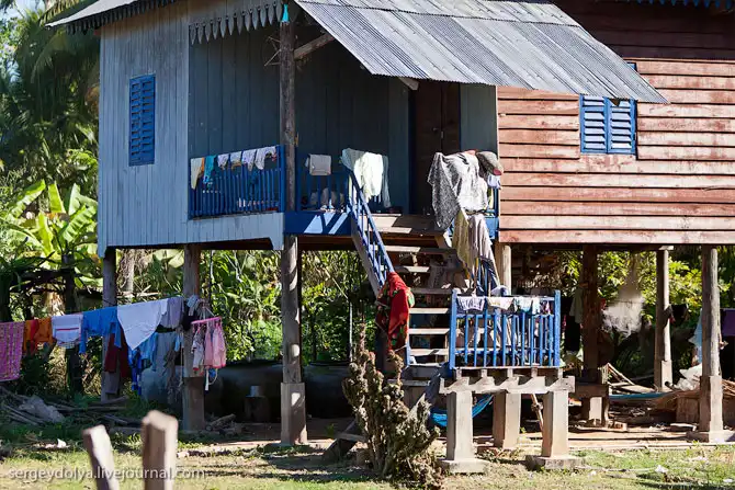 Живут в Камбодже, мягко скажем, не богато. Дома похожи на избушки на курьих ножках. Люди спят в гамаках под домами, а кухни вынесены на улицу под навес.