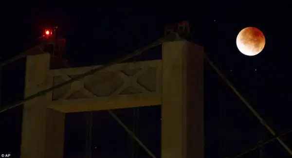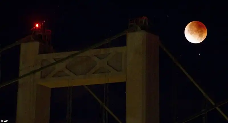 К тому же, это был последний шанс увидеть «невероятное» лунное затмение с красной луной и восходящим солнцем одновременно в небе. В отличие от солнечного, лунное затмение – довольно частое явление, происходящее, в среднем, каждые два года. А все потому, что луна на одну треть меньше Земли, поэтому легко помещается в тень нашей планеты. На фото: луна над мостом Золотые ворота. (AP)