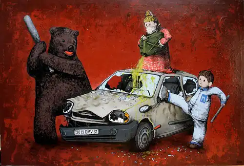 Французский художник Dran очень креативно, с долей черного юмора цинично высмеивает в своих рисунках современную культуры, образы жизни и капиталистический строй в общем. Ему 31 год из которых 16 он занят исключительно рисунком. Все его работы были объеденены и выпущены в одной книге с циничным названием «I love my world».