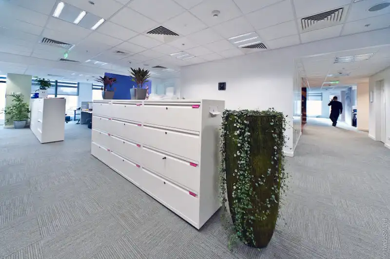 Весь свет в офисе, естественно, филипсовский. Помещения оборудованы датчиками, выключающими его если нет движения 40 минут. Специальная система адаптирует искусственное освещение к естественному свету, то есть вечером лампы горят более ярко, чем днем. Кроме этого, оптическая система делает так, что ни одна лампа не светит в глаза и кажется, что они выключены. На фото видна только одна ближайшая лампа в потолке, остальных как бы нет.